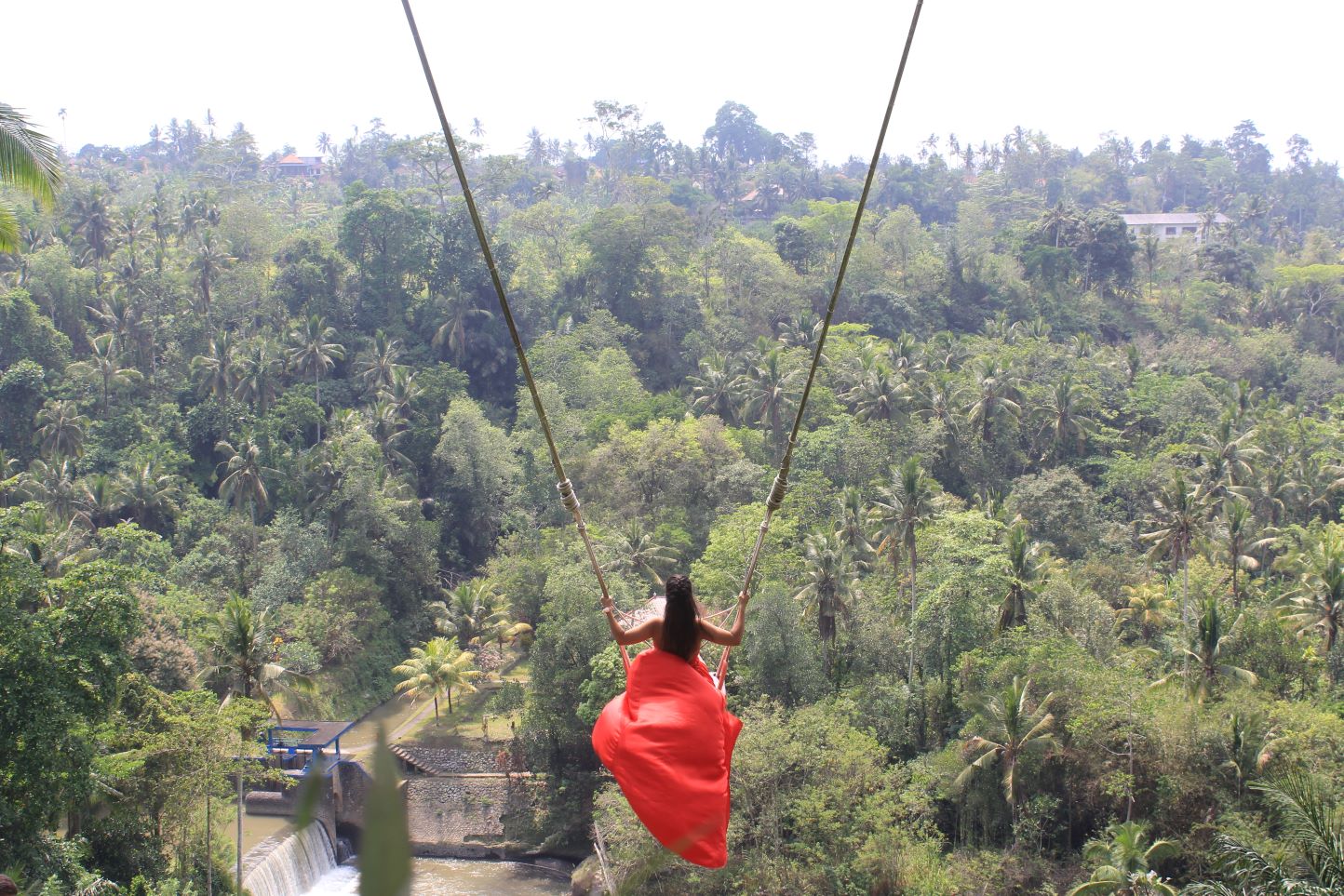 Meanwhile, a woman in a flowing red dress swings high above the lush Tegalalang jungle valley in Ubud, Bali, with tropical trees and a river below.