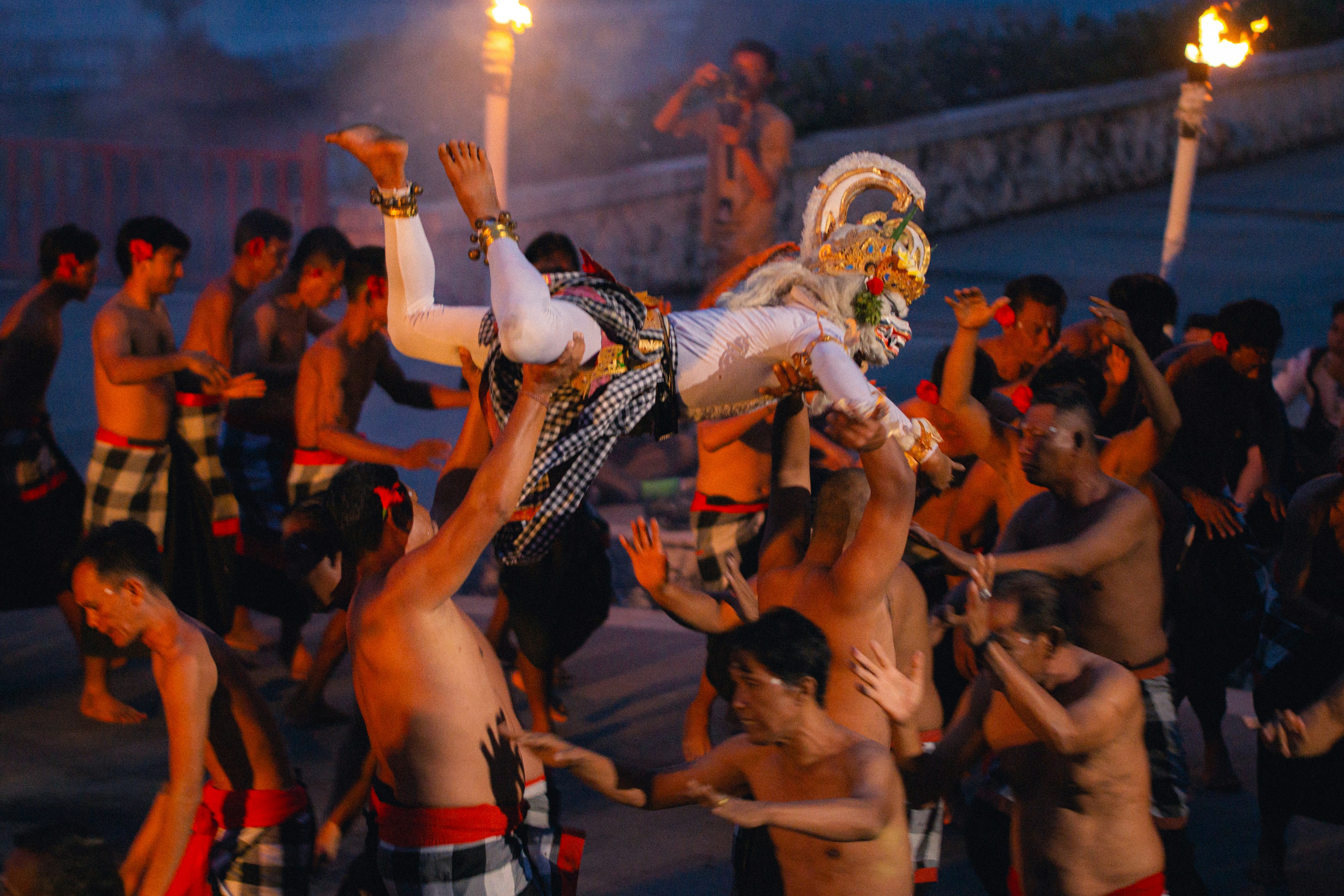 Unlike most performances, the Kecak uses no instruments. Instead, around a hundred men form a circle and chant “cak, cak, cak” in rhythm, representing an army of monkeys that helps Rama. The sound builds like a heartbeat, creating an energy that fills the air with intensity and emotion.