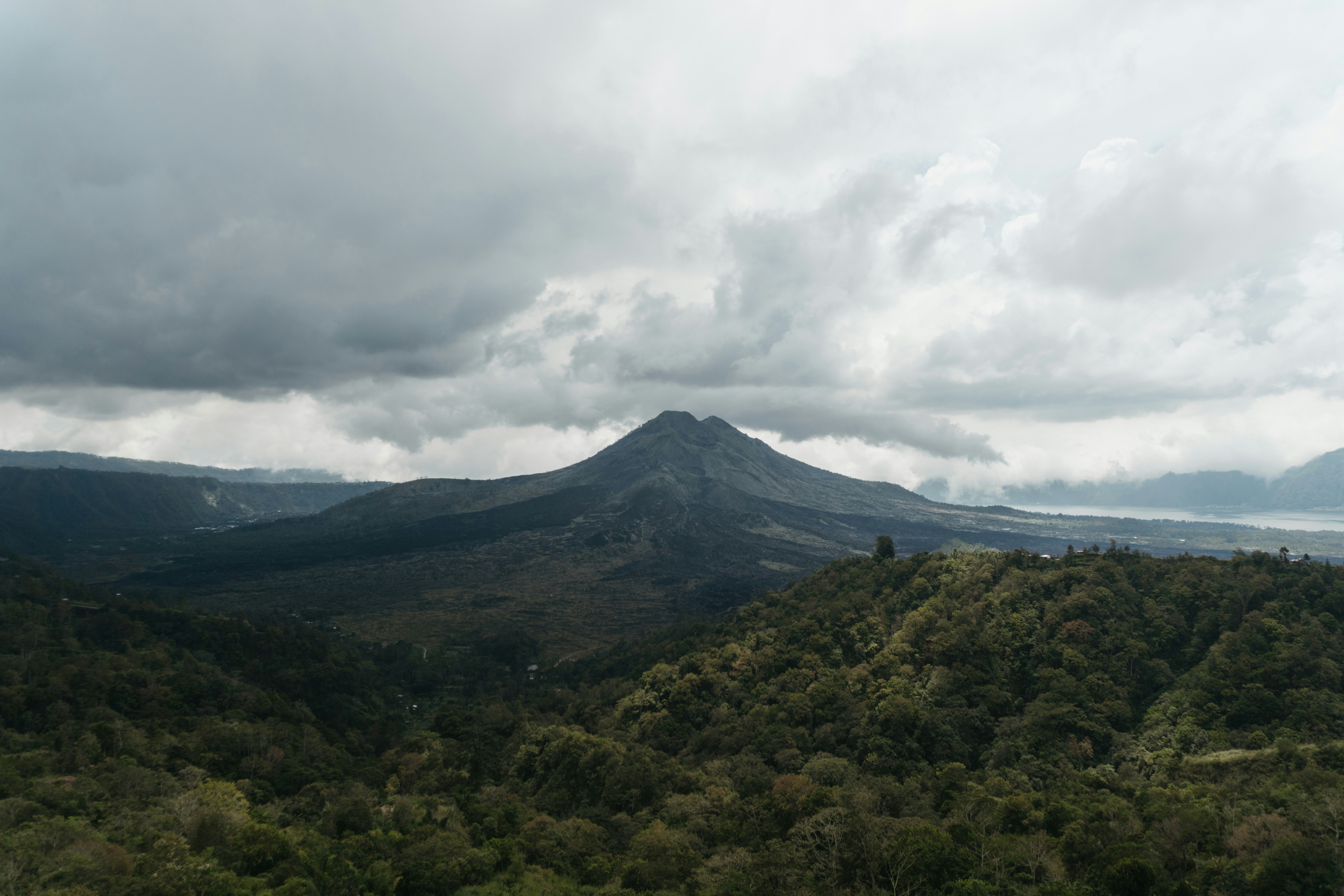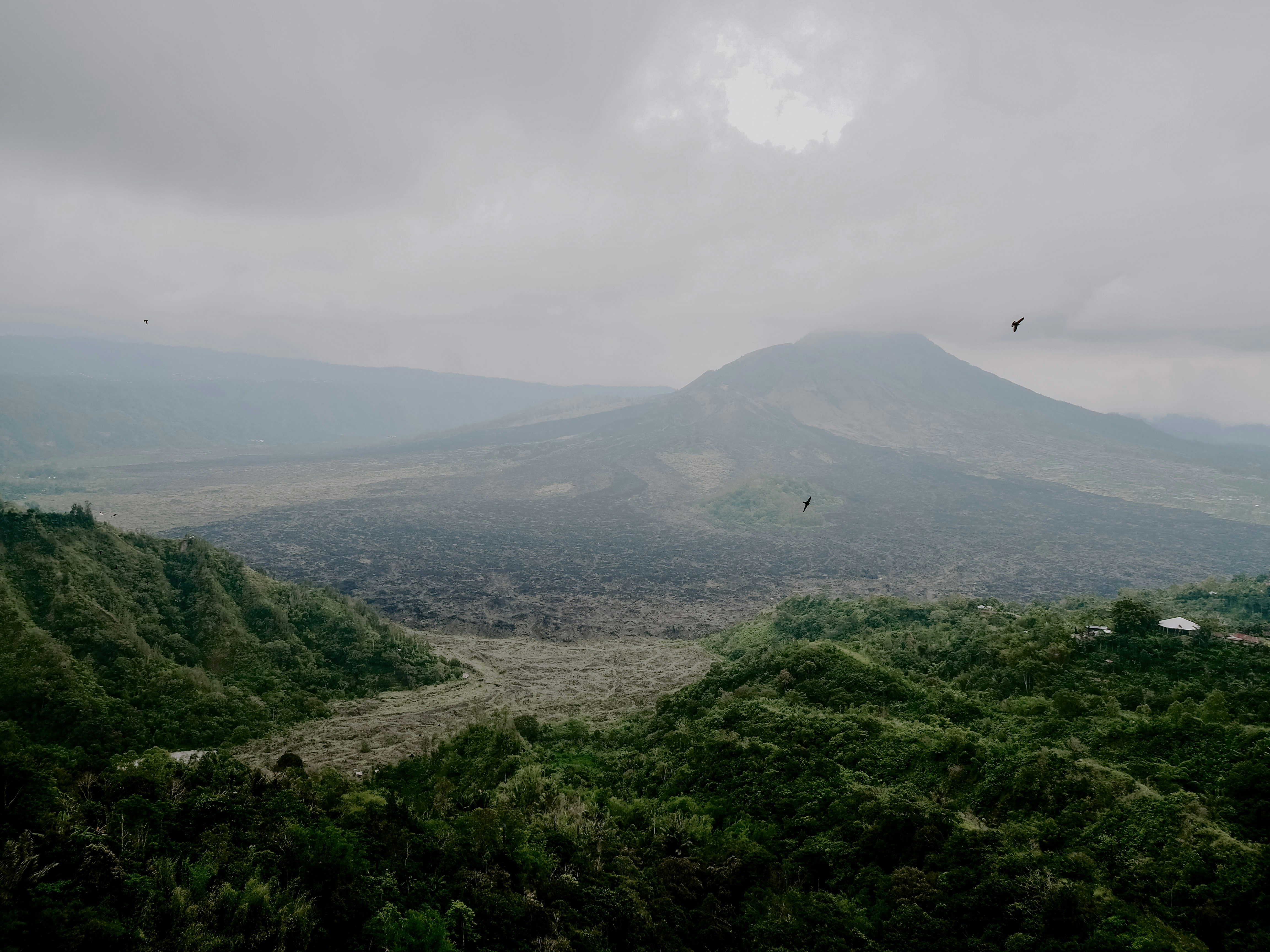 A scenic view of Mount Batur and its black lava fields surrounded by lush green hills