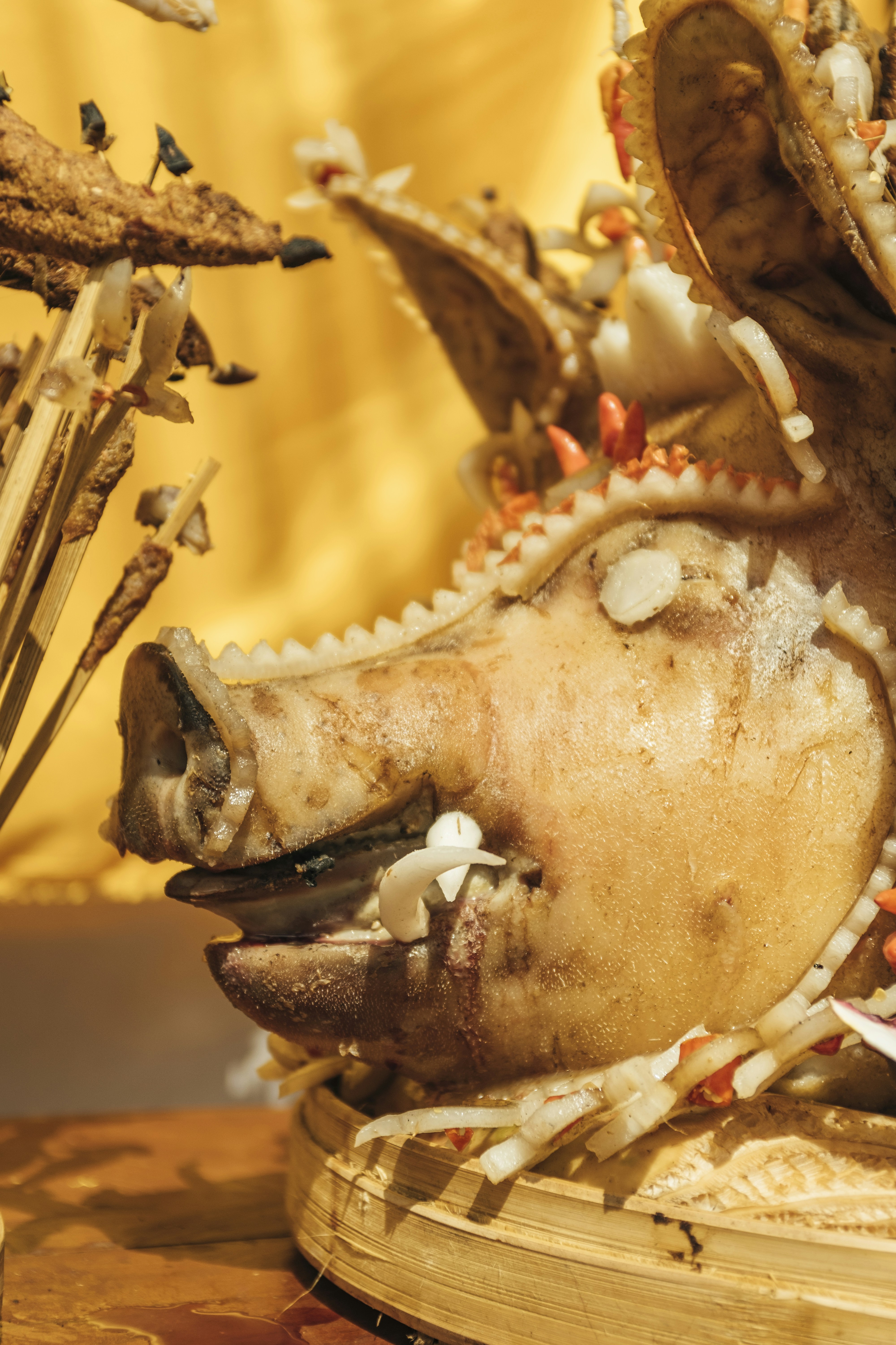 A close-up of a traditionally decorated Balinese roasted pig head (babi guling), adorned with vibrant spices and garnishes, often served during ceremonial feasts or cultural dining experiences on a Bali culinary tour.